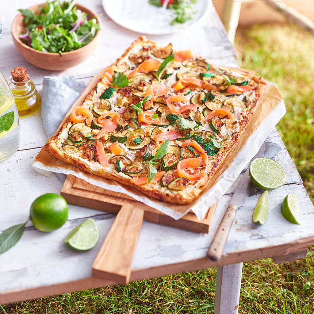 Tarte fine courgette et saumon Retrouvez les saveurs du printemps grâce à cette recette réalisée avec notre pâte feuilletée pur beurre Rectangulaire !