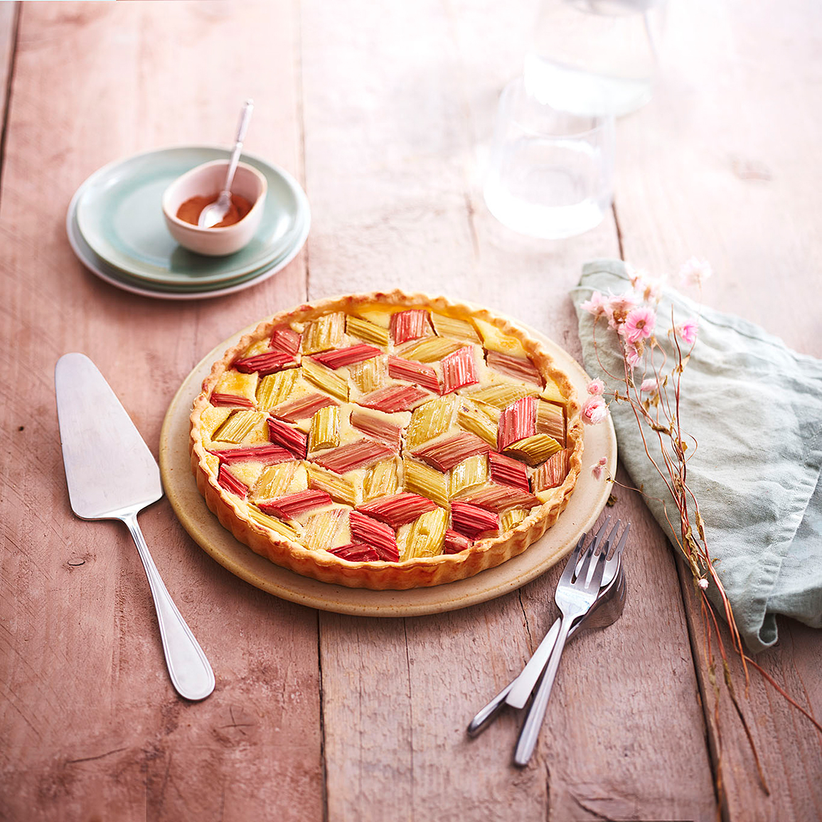 Déposez vos tronçons de rhubarbe sur votre tarte en les laissant à la surface de votre préparation. Pour plus de sophistication, amusez-vous à les disposer de façon géométrique.