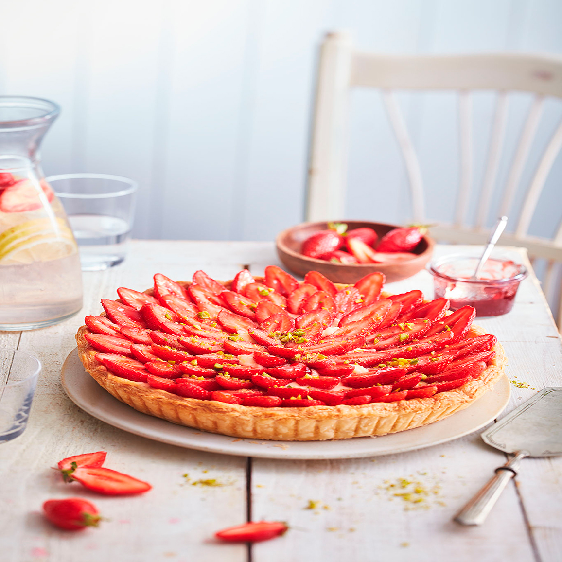 Pour plus de brillance et de relief, vous pouvez enduire vos fraises de gelée de groseille et parsemer votre tarte d’éclats de pistaches.