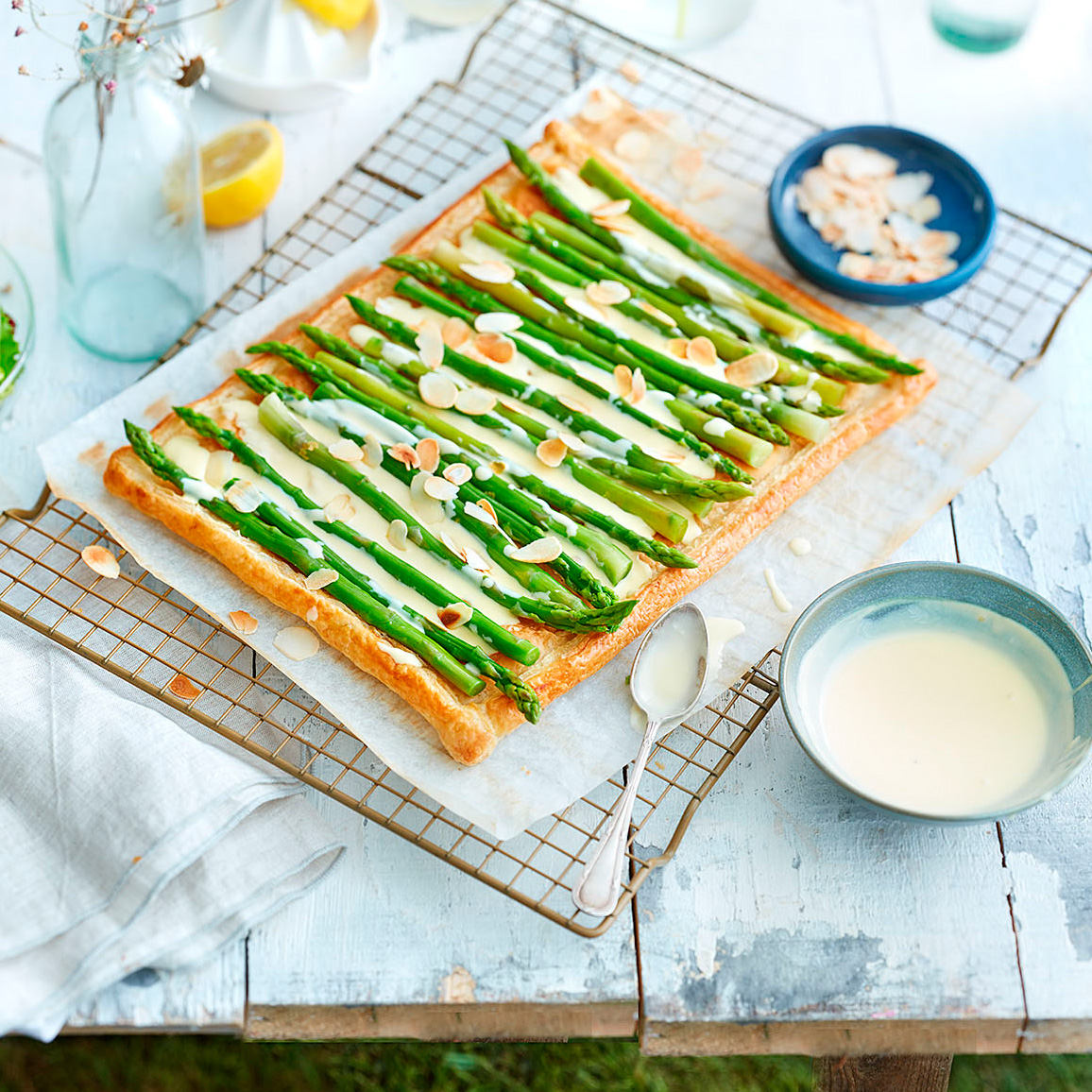 Sur un plat de service, dressez en disposant vos asperges sur la tarte et en versant délicatement votre sauce par-dessus. Enfin décorez avec quelques amandes effilées.