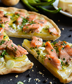 Coupez le saumon fumé en morceaux et parsemez-le sur votre tarte une fois celle-ci refroidie.