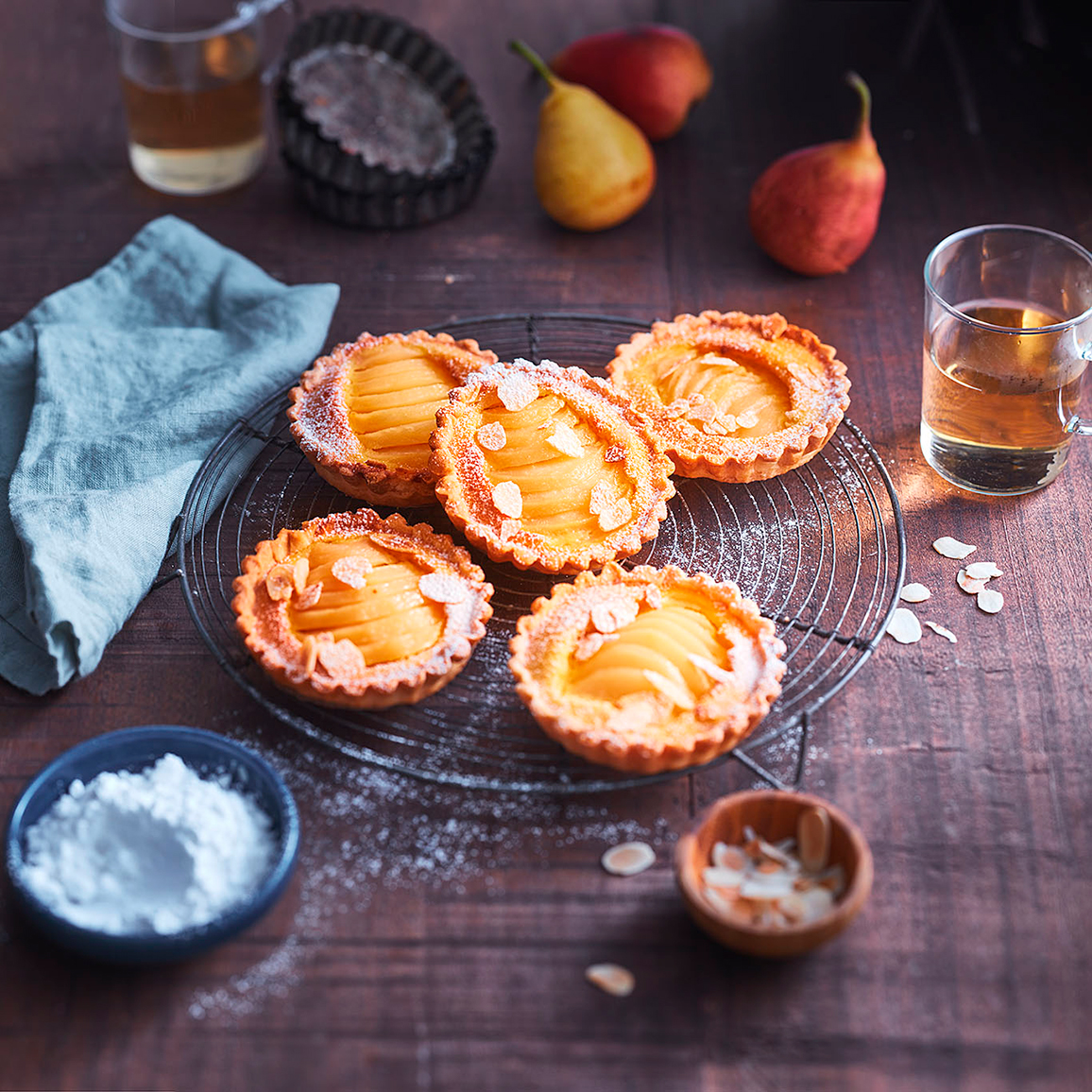 Sortez les tartelettes du four. Enlevez les haricots secs et le papier sulfurisé, puis garnissez les tartelettes avec l’appareil amandine et ajoutez les dés de poires.