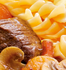 TorsadesUne recette au cœur du terroir français : un bœuf bourguignon avec une viande origine France mijotée dans une sauce au vin rouge et aromates, le tout accompagné de torsades, pour un plat riche en goût.