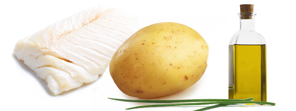 eau, chair de MORUE 24,8% (CABILLAUD, sel), flocons de pommes de terre 8,3%, huile d’olive vierge extra 5,9%, crème fraîche, LAIT écrémé en poudre, OEUFS de poules élevées en plein air, chapelure (farine de BLE, sel, levure, épices), ail, jus de citron 1,1%, amidon de maïs cireux, ciboulette 0,6%, fumet de POISSON 0,3% (chair de POISSON , jus de POISSON, sel), sel, poivre, curcuma.