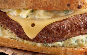 Emmental, petits oignonsFaites-vous plaisir avec ce burger composé d’un pain spécial garni de steak haché pur bœuf de race charolaise cuit, d’une sauce à l’échalote et estragon, et d’emmental.