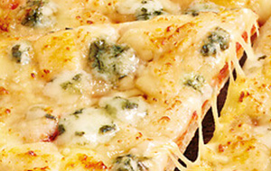 Découvrez toute la gourmandise de notre pizza CroustiFine 4 Fromages, avec de l’édam, de l’emmental, de la mozzarella filante, du roquefort AOP et une sauce tomate cuisinée par nos soins avec des oignons et de l’origan. Le tout sur une pâte fine dorée et croustillante, cuite au feu de bois.