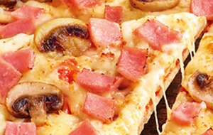 pâte cuite au feu de bois 42,3% (farine de BLÉ origine France 26,6%, eau, huile de colza, levure boulangère, sel), sauce tomate cuisinée 28,9% (purée de tomate origine France 15,9%, eau, oignons 1,2%, farine de BLÉ, huile de colza, origan, basilic, sel), EMMENTAL 9%, jambon cuit supérieur fumé 8,3% (jambon de porc origine France, sel, arômes naturels*, antioxydant : acide ascorbique), MOZZARELLA 6%, champignon de Paris 5,5%.