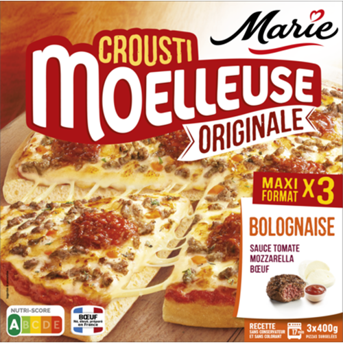 sauce tomate, mozzarella, bœufUne sauce Bolognaise cuisinée et accompagnée de bœuf origine France, des oignons, des carottes, de la mozzarella fondante sur une sauce tomate, le tout sur une pâte crousti-moelleuse.