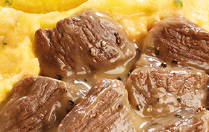 embeurrée de pomme de terreDélicieuse recette de bœuf cuit dans une sauce au poivre servi avec une embeurrée de pommes de terre.