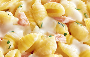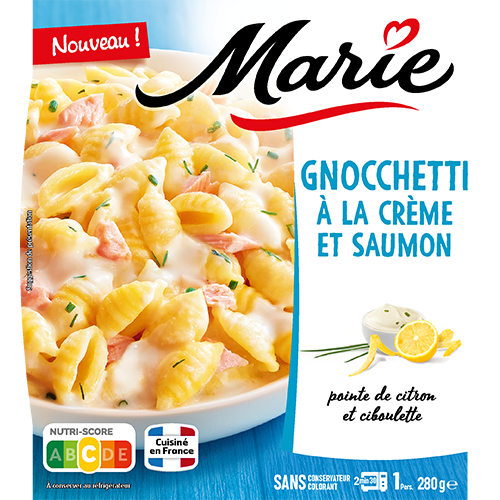 Gnocchetti : origine Italie. Crème fraîche : origine France. Saumon Atlantique : Chili, Norvège, Ecosse