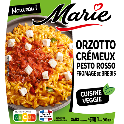 pâtes type ‘orzo’ cuites 34,6% (eau, semoule de blé dur, huile de colza), crème fraîche 18,5%, eau, pesto à la tomate 8,3% (pulpe de tomates au jus 4% (tomates, jus de tomates), double concentré de tomates 0,9%, fromage râpé, basilic 0,5%, farine de blé, tomates semi déshydratées et marinées 0,3% (tomates, huile de colza, sel, origan, ail), purée d’ail, eau, huile d’olive vierge, huile de colza, sel, paprika), fromage de brebis 5%, fromage râpé, échalotes, pulpe de tomates au jus 2,6% (tomates, jus de tomates), poivrons rouges, courgettes, farine de blé, vin blanc, double concentré de tomates 0,8%, basilic, sel, ail, thym, extrait de légumes (tomate, oignon, poivrons, aubergine grillée, ail, courgette), huile d’olive vierge extra, sel, poivre.