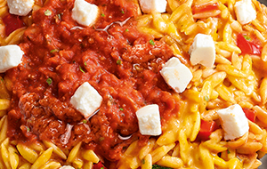 pesto rosso fromage de brebisUn savoureux orzotto cuisiné avec du pesto rosso, avec toute la gourmandise de la crème et du fromage de brebis pour un plaisir généreux et réconfortant.