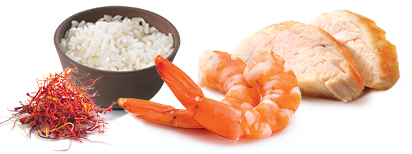 ‘Riz cuit 43% (eau, riz, curcuma), eau, poulet mariné au citron et cuit 6,3% (viande de poulet origine France 6,2%, sel, jus de citron), CREVETTES décortiquées 4,4% (CREVETTES, eau, sel), chorizo précuit pelé 3,5% (viande de porc origine France, gras de porc, épices et plantes aromatiques, sel, arômes naturels), oignons, petits pois, poivrons rouges, poivrons verts, MOULES décoquillées cuites 3,1%, double concentré de tomates, anneaux de CALAMARS 2 % (CALAMARS , sel), tomates, huile de colza, sel, jus de citron, ail 0,2%, jus de LANGOUSTINE, amidon, curcuma, extrait de piment, safran.