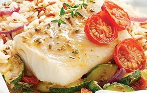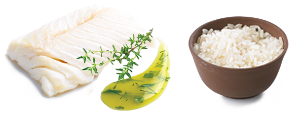 riz cuit 35,8% (eau, riz, riz rouge), CABILLAUD 22,2%, courgettes grillées 11%, jus au thym 9,6% (huile d’olive vierge, jus de citron, eau, huile de colza, ail, sel, thym 0,2%, amidon de riz), oignons rouges 7,2%, demi-tomates cerises 6,6%, eau, tomates semi déshydratées et marinées 2,2% (tomates, huile de colza, sel, origan, ail), huile de colza, coriandre, sel.