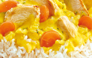 Parce qu’on a tous envie d’évasion, Marie allie une sauce intense au lait de coco et curry et un riz basmati parfumé.