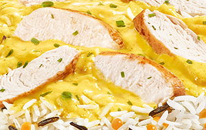 Une recette gourmande avec du poulet origine France et une sauce onctueuse au curry et lait de coco, relevée par une pointe de gingembre. Le tout accompagné d’un savoureux duo de riz basmati et sauvage.