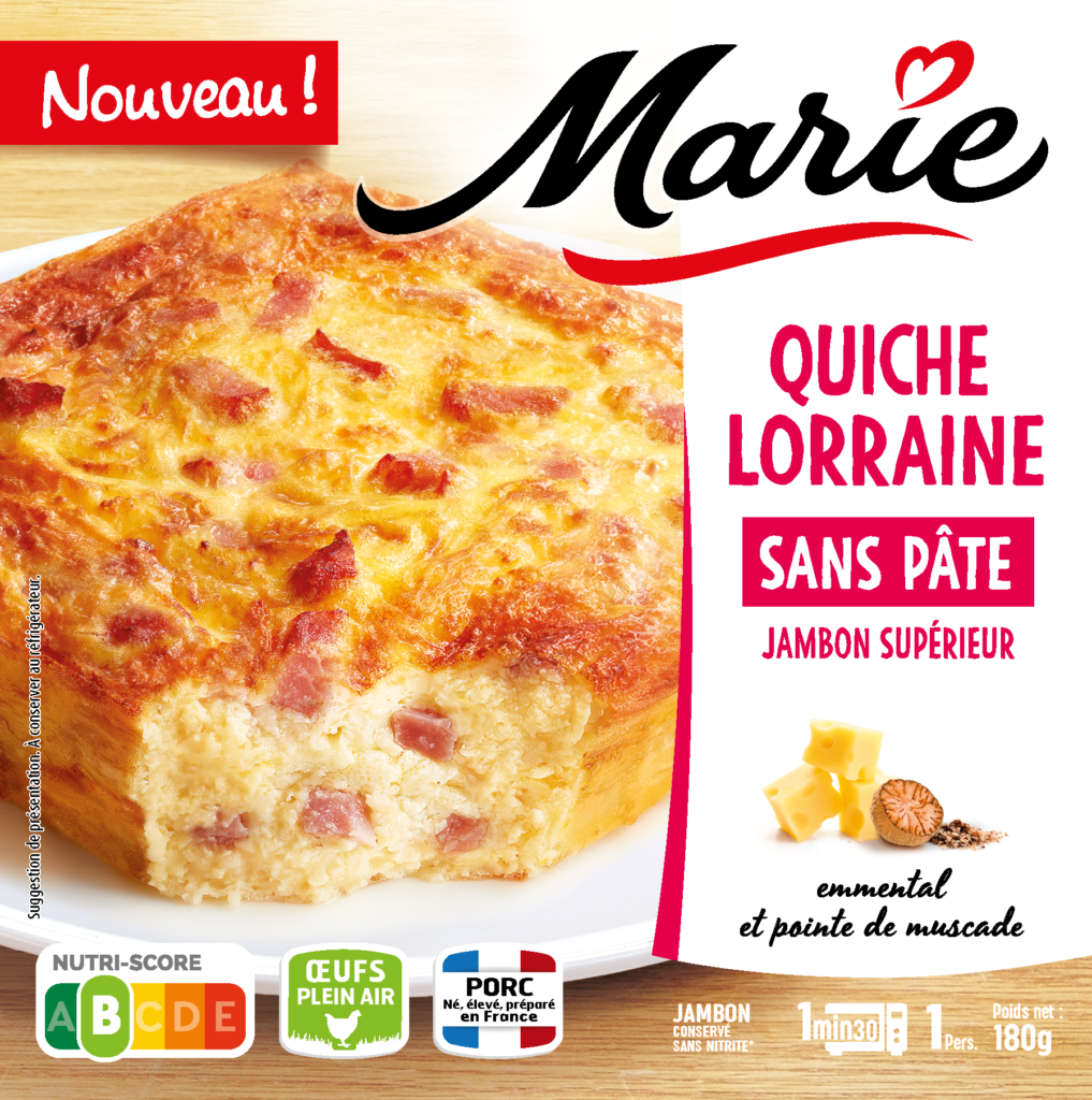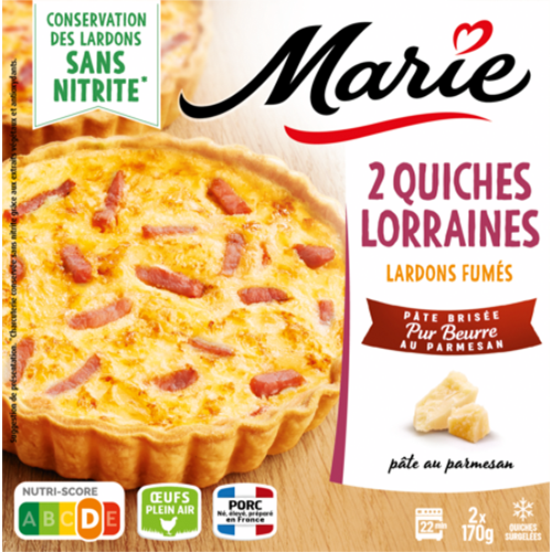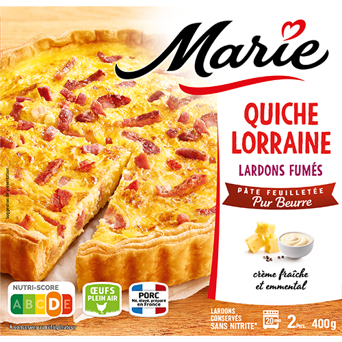 Marie sélectionne des ingrédients de qualité : cette quiche est cuisinée en France avec des œufs de poules élevées en plein air et des lardons issus de porc né, élevé et préparé en France.