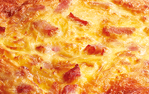 eau, blanc d’OEUF de poules élevées en plein air 16,6%, EMMENTAL 14%, jambon cuit supérieur fumé 13,2% (jambon de porc origine France, sel, arômes naturels*, antioxydant : acide ascorbique), pommes de terre, OEUFS de poules élevées en plein air 5,8%, LAIT écrémé en poudre, FROMAGE blanc, amidon de maïs, farine de BLÉ, crème fraîche 1,1%, sel, muscade, poivre blanc.