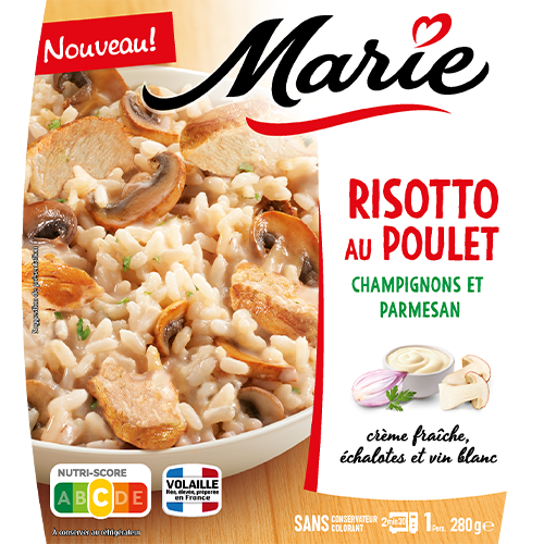 riz cuit 33,2% (eau, riz), viande de poulet marinée au citron et cuite 20,7% (viande de cuisse de poulet origine France 20,3%, sel, jus de citron), crème fraîche origine France 13%, champignons de Paris 11,9%, eau, PARMESAN (Parmigiano Reggiano AOP) 2,6%, farine de BLE, fond de volaille (bouillon de poulet, graisse de poulet, carottes, sel, thym, laurier), échalotes 1,6%, vin blanc 0,6%, persil, bouillon de légumes [légumes et jus de cuisson de légumes (tomate, oignon, poivrons, aubergine grillée, ail, courgette), huile d’olive vierge, sel, épice], jus concentré de champignon de Paris, huile de tournesol, sel, thym, cèpe en poudre, poivre blanc.