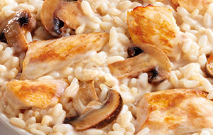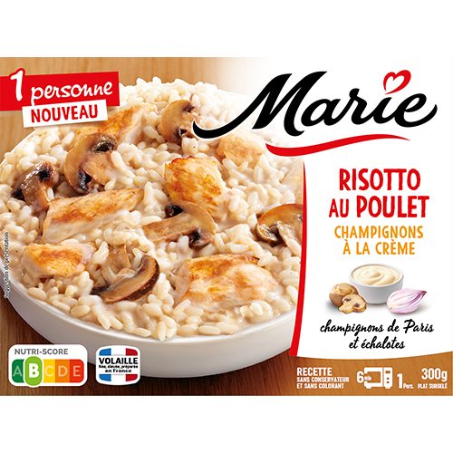 pour 1Le classique et gourmand Risotto, cuisiné avec du poulet origine France mariné au citron, des champignons de Paris et une sauce gourmande à la crème fraîche, au fromage et à l’échalote.