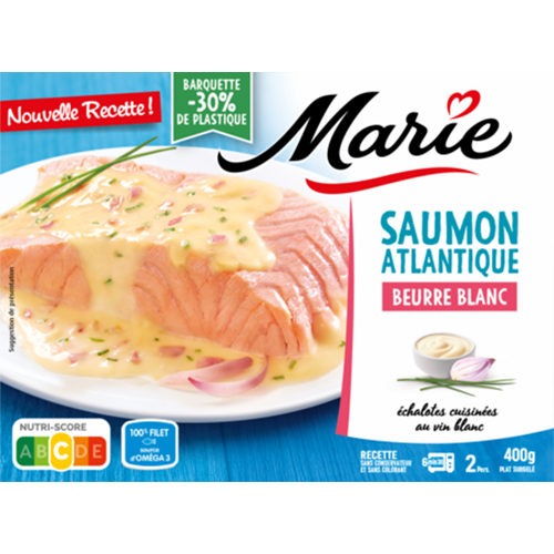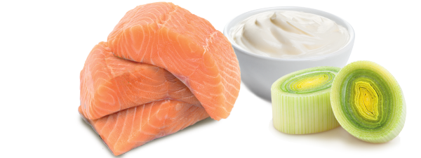SAUMON ATLANTIQUE 49%, poireaux 15,8%, crème fraîche 14,4%, eau, échalotes 3,7%, BEURRE 2,3%, carottes, vermouth 0,9%, amidon de maïs, jus de citron, sel, ciboulette, estragon 0,05%, poivre, curcuma.