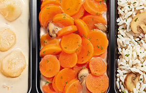 riz cuit 24,4% (eau, riz long étuvé), carottes 22,5%, NOIX DE SAINT–JACQUES* 15%, eau, crème fraîche 9,4%, champignons de Paris 5,9%, cidre 2,9%, farine de BLÉ, échalotes 2%, huile de colza, BEURRE, sel, vinaigre de cidre, persil, fond de volaille (bouillon de poulet, graisse de poulet, carottes, sel, thym, laurier), ciboulette, purée d’ail, ail, poivre blanc, curcuma.