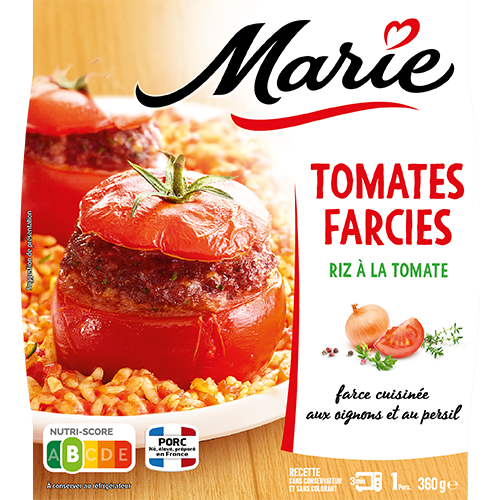Tomates farcies 61,1% (tomates fraîches 38,8%, viande et gras de porc origine France 10,2%, viande de porc cuite origine France 5,5%, oignons 2,5%, persil 1,3%, ail, double concentré de tomates 0,7%, sel, eau, poivre), riz cuit 15,1% (riz, eau) , pulpe de tomates au jus 14,9% (tomates, pulpe et jus de tomates), oignons 2,7%, double concentré de tomates 2,3%, huile de colza, FROMAGE râpé, persil 0,4%, ail, sel, fond de volaille (bouillon de poulet, graisse de poulet, carottes, sel, thym, laurier), thym 0,05%, poivre, piment fort.