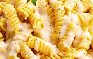Torsades cuites 60,7% (eau, semoule de BLÉ dur, eau), eau, crème fraîche 10,1%, FROMAGE à raclette origine France 4,1%, FROMAGE à pâte dure râpé 4,1%, EMMENTAL 3,1%, huile de colza, farine de BLÉ, sel, ail 0,3%, persil 0,2%, poivre blanc, curcuma, muscade.